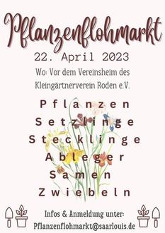 Dieser Flohmarkt findet am Samstag, den 22. April 2023, vor dem Vereinsheim des Kleingärtnervereins Roden statt. Aufbaubeginn ist um 9:00 Uhr. Im Anschluss haben die Pflanzenliebhaber*innen bis ca. 15:00 Uhr Zeit, die Vielfalt des Angebots zu durchstöbern.