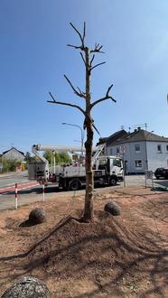 Die Höhe des hier umgepflanzten Großbaumes beträgt etwa 6,50 m und der Stammumfang 40-50 cm.