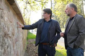 Bei einer gemeinsamen Begehung des Beigeordneten Gerald Purucker und Ralf Hoffmann, dem stellvertretenden Amtsleiter des Amts für Stadtplanung, Hochbau, Denkmalpflege und Umwelt, wurde die erfolgreich sanierte Einfriedungsmauer am Soutyhof in Augenschein genommen.