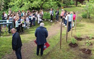 Die Pflanzung der Naschbeerenhecke im Schulgarten hat der Neue Betriebshof Saarlouis übernommen. Danach wurde die Hecke im Rahmen einer kleinen Feierstunde zusammen mit Schülern der vierten Klasse eingeweiht. Sie hatten zwei Lieder und ein Gedicht im Gepäck und brachten damit alle Anwesenden zum Staunen. Als kleiner Vorgriff auf die hoffentlich bald reichhaltige Ernte der Hecke gab es für alle Anwesenden schonmal ein paar Himbeeren vorab, die die Schülerinnen und Schüler verteilten.
