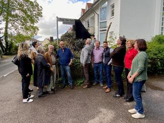 Enthüllung mit dem Verein für Mundart und Geschichte, OB Peter Demmer und Vertretern der Stadtpolitik: In Beaumarais informieren Zusatzschilder über das Wirken zweier Frauen, nach denen Straßennamen im Stadtteil benannt sind.