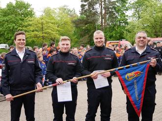 Wehrführer Knut Kempeni ernannte auf Vorschlag des Ausschusses der Jugendfeuerwehr Stefan Christoph (Lbz. West) zum neuen Stadtjugendfeuerwehrbeauftragten und Marcel Leipold (Lbz. Ost) zu seinem Stellvertreter. Er dankte beiden, dass sie sich für dieses verantwortungsvolle und zeitaufwendige Amt zu ihrem normalen aktiven Feuerwehrdienst zur Verfügung gestellt haben und wünschte ihnen viel Erfolg und eine breite Unterstützung, worauf die beiden bisherigen Amtsinhaber den Wimpel bzw. Stab offiziell an die Neuen übergaben.