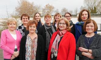 Hintere Reihe: Hella Arweiler, Julia Harenz, Sabine Grünwald, Ursula Trappe, Marie Jerzenbeck (Leiterin des Frauenhauses), Christine Löffler-Hollinger Vorne: Rita Lesch, Dr. Sabina Hartnack, Almuth Zempel, Käthe Schmitt (Es fehlt: Marlies Reimringer)