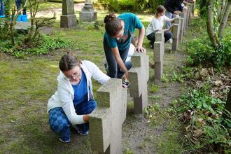 Unter Anleitung ihrer Lehrerin, Frau Dr. Kell, und mit Unterstützung des Volksbundes Deutsche Kriegsgräberfürsorge reinigten die Jugendlichen am Nachmittag mehrere Grabsteine mit Wasser und Bürsten. Anschließend begannen sie damit, teils verblasste Inschriften vorsichtig zu erneuern. Die dafür nötigen Materialien – Eimer, Bürsten, Farbe und Pinsel – wurden vom Neuen Betriebshof Saarlouis (nbs)durch Dietmar Esser und Dominik Lieblang bereitgestellt.