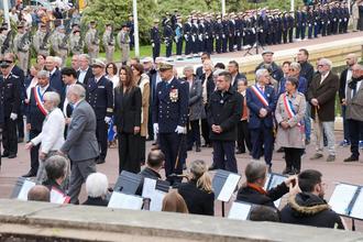 Gemeinsames Erinnern: OB Marc Speicher wurde die Ehre zuteil neben Bürgermeister David Samzun und der französischen Ministerin Patricia Miralles in Saint-Nazaire vor 2.500 Menschen an das Ende des Zweiten Weltkrieges zu erinnern. Es war zugleich sein Antrittsbesuch in der Saarlouiser Partnerstadt am Atlantik.