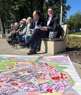Unter dem Motto „Komm sproochen“ suchten Bürgermeister Carsten Quirin und Beigeordneter Gerald Purucker das direkte Gespräch mit den Bürgerinnen und Bürgern. Ebenfalls im Fokus stand das Quartiersmanagement „on Tour“: Quartiersmanagerin Jessica Fischer und Dr. Viola Kirchner von der Stabsstelle Sozialer Zusammenhalt – die den Tag federführend geplant hatten – stellten ihre Arbeit vor und gaben Einblicke in laufende Projekte. Weitere Programmpunkte waren eine Führung über den neu gestalteten Gutenbergplatz, ein begehbarer Stadtplan mit Citymanagerin Kirsten Cortez sowie Informationen der AG Klimastark zu ihrem ehrenamtlichen Engagement für den Klimaschutz.