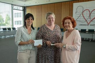 Landkreis Saarlouis/J. Büch - Ingrid Brühl vom Kunst Forum Saarlouis übergibt die Spendengelder an (v.l.) Sandra Weiss vom Caritasverband, Anette Berrahma von der Therapeutischen Schülerhilfe.