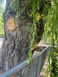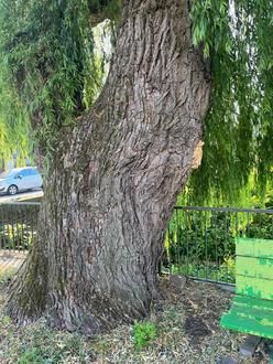 Die Trauerweide in der Mühlenstraße ist von einem holzersetzenden Pilz befallen. Um einem Stammbruch vorzubeugen, muss sie beschnitten werden.