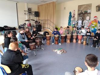 „Trommeln, das ist nonverbale Kommunikation, und die Kinder können ihre Selbstwirksamkeit darüber erleben, einfach ohne Sprache“, so Schweitzer. Außerdem bestärkt es Kooperation und fördert damit eine positive Gruppendynamik. Und sehr gruppendynamisch geht es auch zu: Verschiedene Rhythmusspiele, Bodyperkussion, viel Bewegung - recht spielerisch nähern sich die Kinder, die in einem großen Kreis in der Aula versammelt sind, dem gemeinsamen Groove.