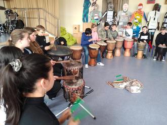 Begeistert schnappen sich die 27 Schülerinnen und Schüler ein neues Instrument. Djembe, Basstrommel, Shaker, Glocken... sowas gibt es nicht jeden Tag an der Martin-Luther-King-Schule in Fraulautern. In Kooperation mit der Freien Kunstschule Picard finden in diesem Schuljahr drei Tagesworkshops rund um Trommeln und Perkussion statt.