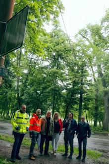 Unter der neuen Eichhörnchenbrücke, von links: Dominik Lieblang und Dietmar Esser von der Grünflächenabteilung des NBS, Ulrich Leyhe (NABU-Ortsgruppe Saarlouis/Dillingen), NBS-Betriebsleiterin Dr. Vanessa Wassong, Beigeordneter Gerald Purucker und der städtische Umweltschutzbeauftragte Dr. Andreas Ney.