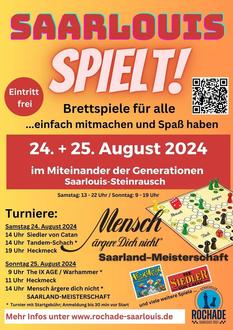 Am Samstag und Sonntag 24./25. August stehen in Steinrausch eine große Auswahl an Brettspielen bereit. Jeder kann sich etwas aussuchen und mit netten Menschen einfach spielen. Der Eintritt ist frei. Das Spielefest beginnt samstags um 14 Uhr im Miteinander der Generationen, Konrad-Adenauer-Allee 138 in Saarlouis-Steinrausch.