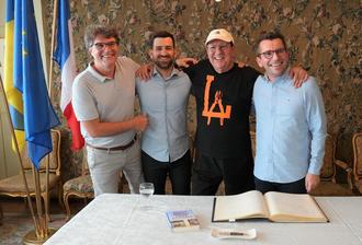 v.l.: Beigeordneter Gerald Purucker, Bürgermeister Carsten Quirin, Herman Rarebell und Oberbürgermeister Marc Speicher. Foto: Sophia Tull