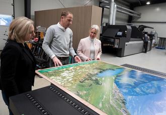 Herausragende Druckqualität made in Weselberg: Geschäftsführer Marcus Kalle informiert bei einem Unternehmerbesuch Landrätin Dr. Susanne Ganster (rechts) und die Geschäfts-führerin der Wirtschaftsförderungsgesellschaft Südwestpfalz, Miriam Heinrich (links), über die Produkte und Dienstleistungen von PRINTEC-SOLUTIONS.