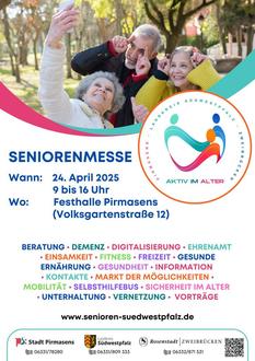 Wie kann ich gut fürs Alter vorsorgen? Welche digitalen Chancen kann ich als Seniorin oder Senior nutzen? Und welche Unterstützung gibt es bei Bedarf für meine pflegenden Angehörigen? Antworten auf diese und viele weitere Fragen bietet die Seniorenmesse „Aktiv im Alter – Vorsorgen • Informieren • Mitgestalten“. Die Leitstelle Älter werden des Landkreises Südwestpfalz und die Seniorenbüros der Städte Pirmasens und Zweibrücken laden am Donnerstag, 24. April 2025, von 9 bis 16 Uhr, in die Festhalle Pirmasens ein. Die Messe richtet sich an Seniorinnen und Senioren sowie ihre Angehörigen und bietet ein umfangreiches Programm mit Vorträgen, Beratungsmöglichkeiten und interaktiven Angeboten. Der Eintritt zu der Seniorenmesse ist frei.