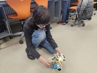 Leon Fichter testet eine Eigenkreation mit einer ungewöhnlichen Fortbewegungsart. Statt zu rollen, soll der Roboter hüpfend vorwärts gehen. Dabei ist die Stabilität der Konstruktion eine Herausforderung.
